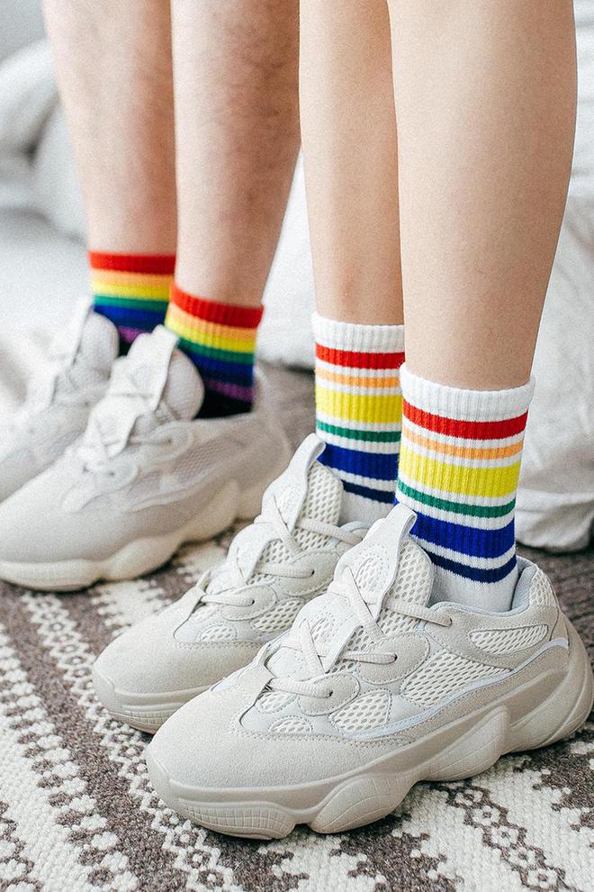 يمكن أن تكون الجوارب المخططة منمقة جدًا أو بسيطة. لديهم أسلوب ياباني جديد عندما يتم مطابقتهم. يمكن مطابقتها مع أي حذاء ، مثل الصنادل ، والأحذية القماشية ، والأحذية الرياضية ، وما إلى ذلك. تحتوي بعض الجوارب المخططة أيضًا على MIX LOGO. اختلافات مختلفة. لكن يجب على جميع الرياضيين الانتباه لتجنب ارتداء الجوارب المخططة الطويلة جدًا
